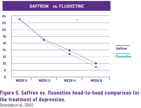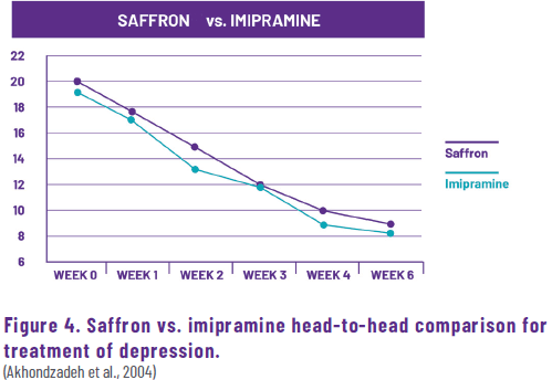 W czterech randomizowanych, podwójnie ślepych, kontrolowanych placebo badaniach, porównano działanie 30 mg szafranu dziennie z terapeutycznymi dawkami dwóch leków przeciwdepresyjnych – fluoksetyny (20 mg/dzień) oraz imipraminy (100 mg/dzień). Wyniki przeprowadzonych badań wskazują, że szafran jest znacznie skuteczniejszy niż placebo i wykazuje skuteczność porównywalną do testowanych, syntetycznych leków przeciwdepresyjnych – imipraminy i fluoksetyny.