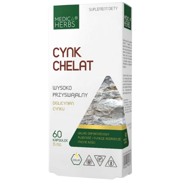 Składniki: (w przeliczeniu na zalecaną porcję do spożycia w ciągu dnia – 1 kapsułka): diglicynian magnezu (chelat magnezu) 800 mg (160 mg magnezu, 43% *RWS); diglicynian cynku (chelat cynku) 55 mg (15 mg cynku, 150% *RWS); chlorowodorek pirydoksyny (witamina B6) 2,1 mg, 150% *RWS; żelatyna (kapsułka).