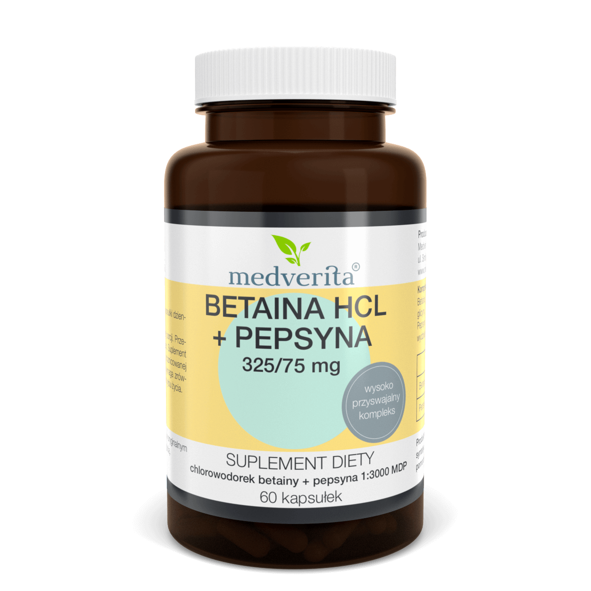 Składniki: betaina (chlorowodorek betainy), pepsyna 1:3000 MDP, żelatyna (otoczka kapsułki).