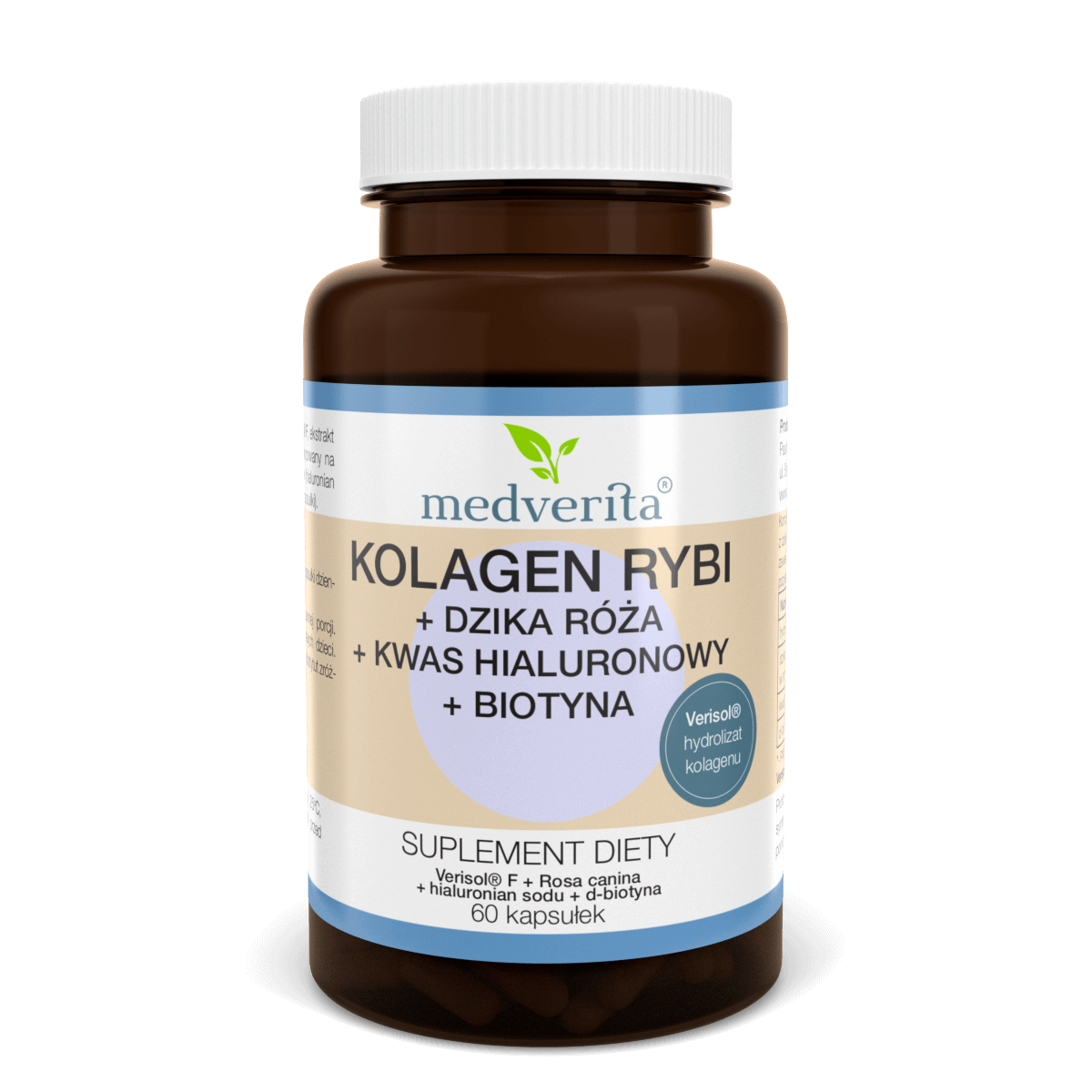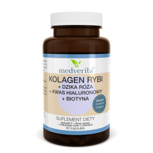 Składniki: hydrolizat kolagenu rybiego Verisol® F, ekstrakt z owoców dzikiej róży (Rosa canina) standaryzowany na zawartość 70% witaminy C, kwas hialuronowy (hialuronian sodu), biotyna (d-biotyna), żelatyna (otoczka kapsułki).