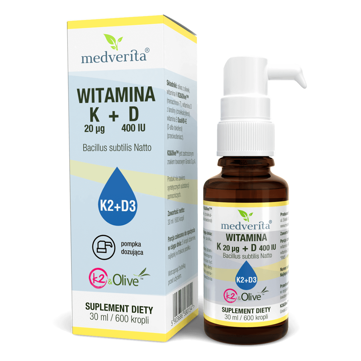 Każda kropla zawiera 400 IU witaminy D oraz witaminę K MK-7 w ilości 20 µg.